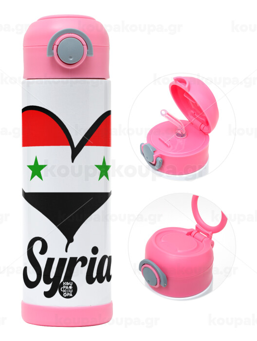 Syria flag, Children's hot water bottle, stainless steel, with safety straw, PINK (500ml)