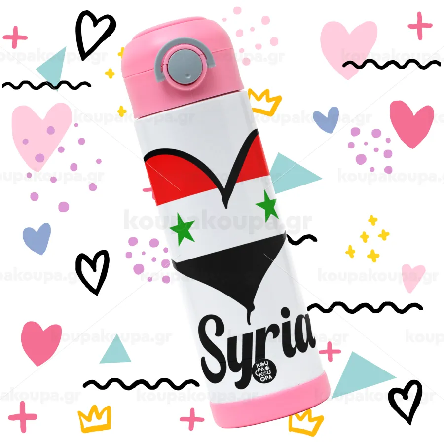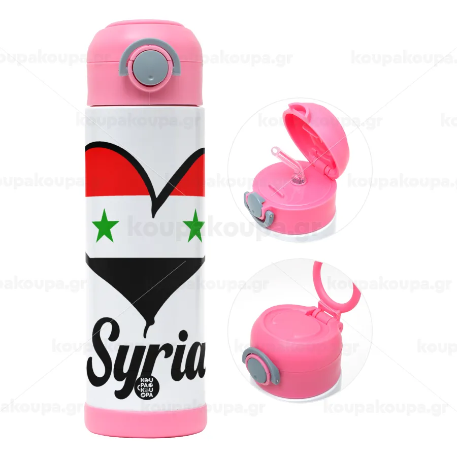 Syria flag, Children's hot water bottle, stainless steel, with safety straw, PINK (500ml)