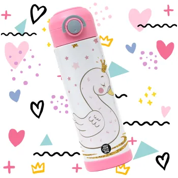 Crowned swan, Children's hot water bottle, stainless steel, with safety straw, PINK (500ml)