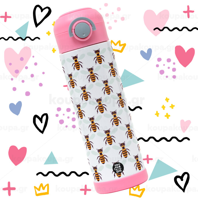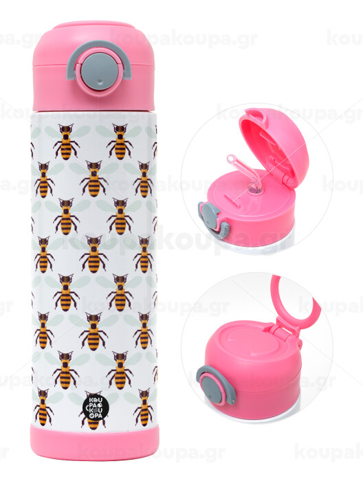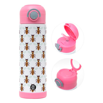 Bee, Children's hot water bottle, stainless steel, with safety straw, PINK (500ml)