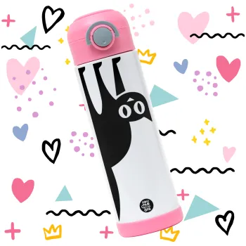 Cat upside down, Children's hot water bottle, stainless steel, with safety straw, PINK (500ml)