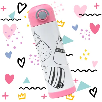 Cute cats, Children's hot water bottle, stainless steel, with safety straw, PINK (500ml)