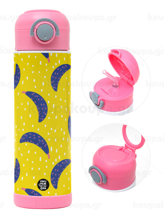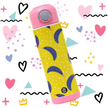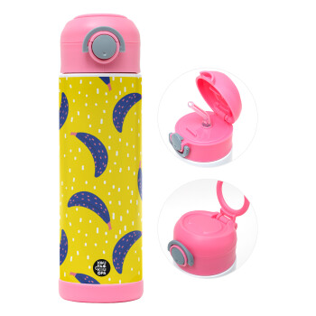 Yellow seamless with blue bananas, Children's hot water bottle, stainless steel, with safety straw, PINK (500ml)
