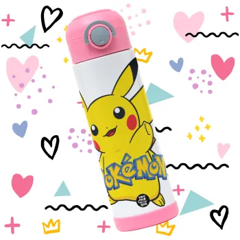 Pokemon pikachu, Children's hot water bottle, stainless steel, with safety straw, PINK (500ml)