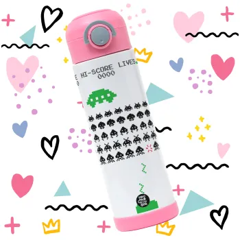 Space invaders, Children's hot water bottle, stainless steel, with safety straw, PINK (500ml)