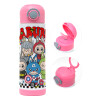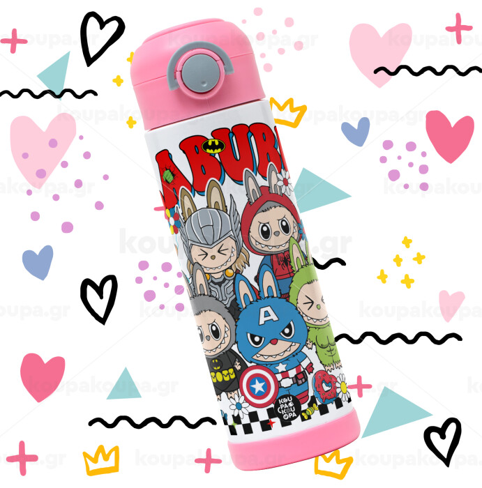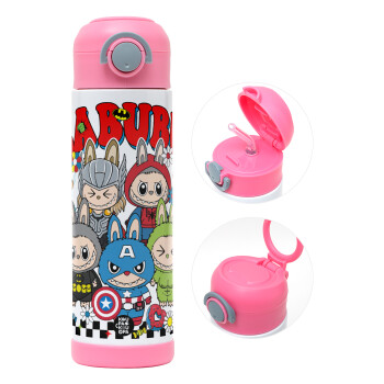Labubu superheroes, Children's hot water bottle, stainless steel, with safety straw, PINK (500ml)