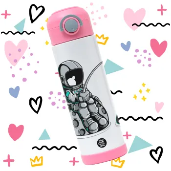 Little astronaut fishing, Children's hot water bottle, stainless steel, with safety straw, PINK (500ml)