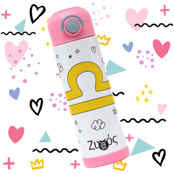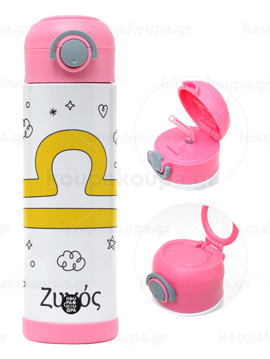 Ζώδια Ζυγός, Children's hot water bottle, stainless steel, with safety straw, PINK (500ml)