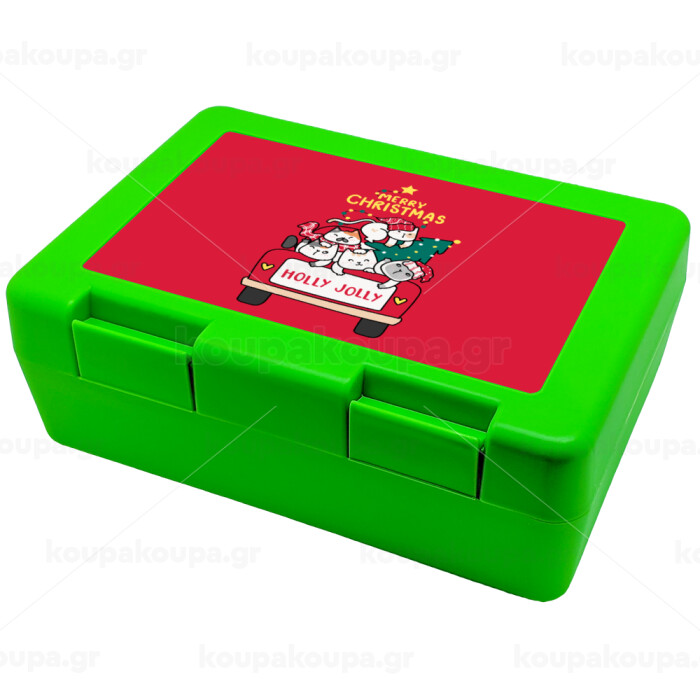 Merry Christmas cats in car, Children's cookie container GREEN 185x128x65mm (BPA free plastic)
