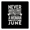 Never Underestimate the poer of a Woman born in..., Τετράγωνο μαγνητάκι ξύλινο 6x6cm