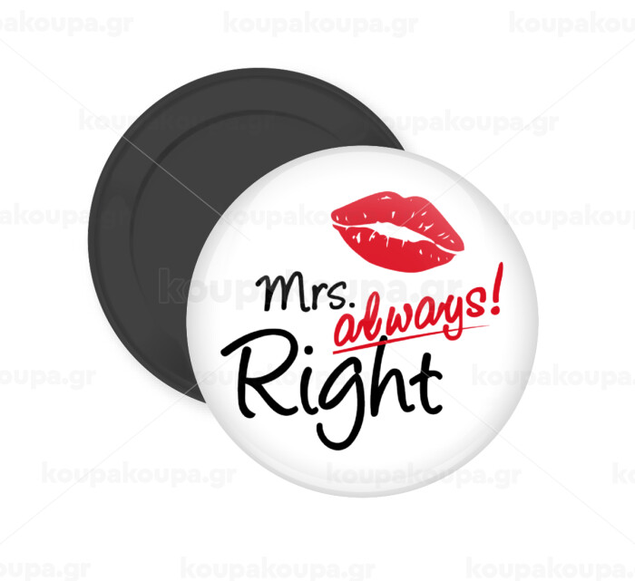Mrs always right kiss, Μαγνητάκι ψυγείου στρογγυλό διάστασης 5cm
