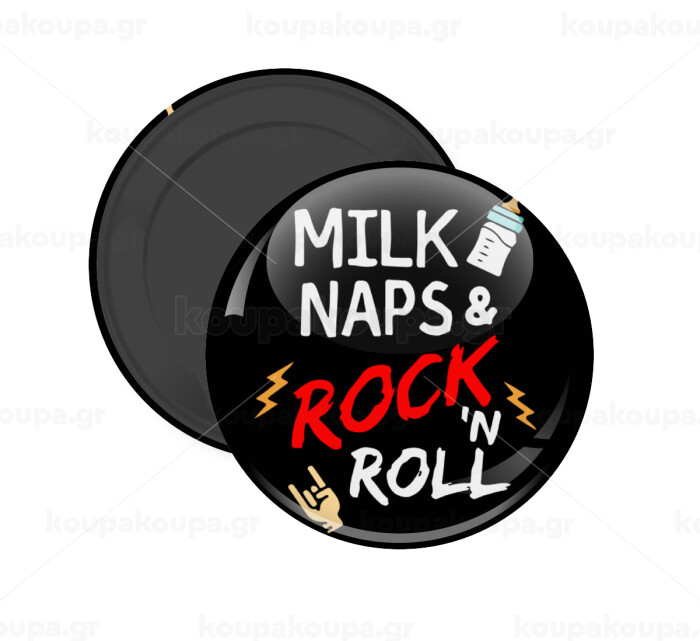 milk naps and Rock n' Roll, Μαγνητάκι ψυγείου στρογγυλό διάστασης 5cm