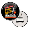 Round magnet and beer opener, shiny with a metallic back, the magnets can be placed on a refrigerator or any other metallic surface. Great durability over time due to the plasticization of the subject.