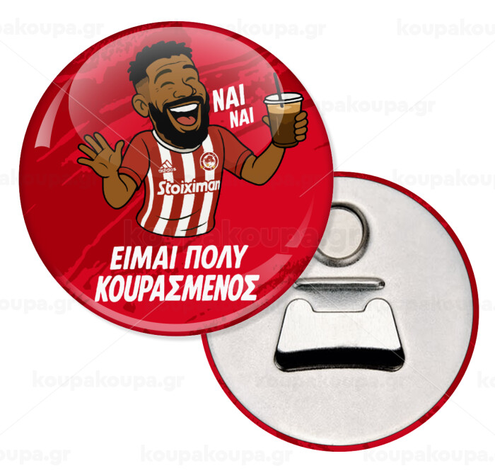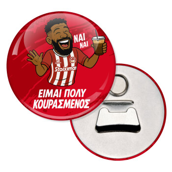 Ροντινέι, "ΠΟΛΥ ΚΟΥΡΑΣΜΕΝΟΣ", Μαγνητάκι και ανοιχτήρι μπύρας στρογγυλό διάστασης 5,9cm