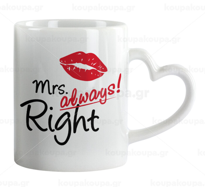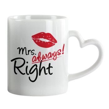 Mrs always right kiss, Mug heart handle, ceramic, 330ml