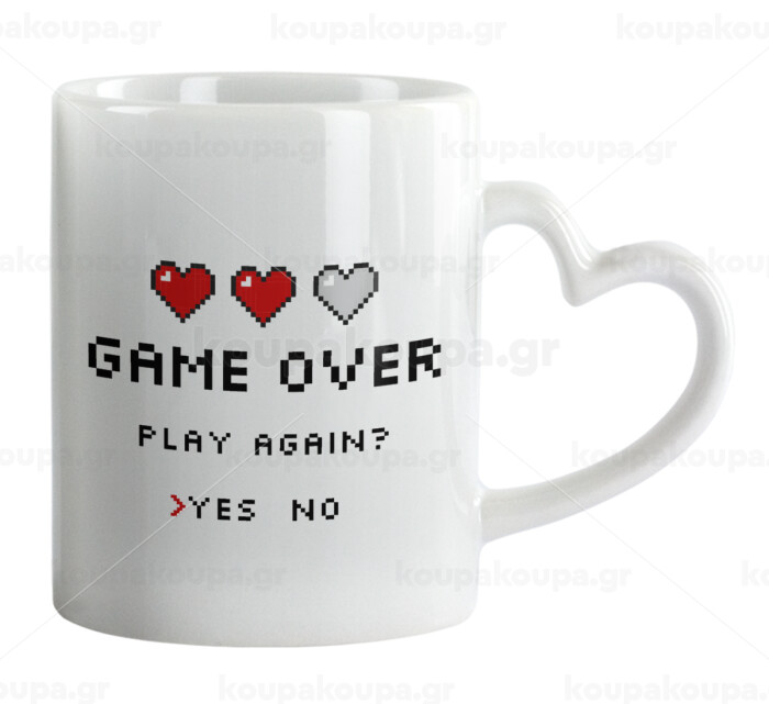 GAME OVER, Play again? YES - NO, Mug heart handle, ceramic, 330ml