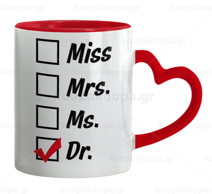 Miss, Mrs, Ms, DR, Mug heart red handle, ceramic, 330ml