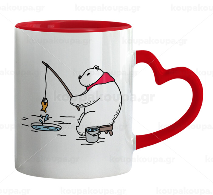 Bear fishing, Mug heart red handle, ceramic, 330ml