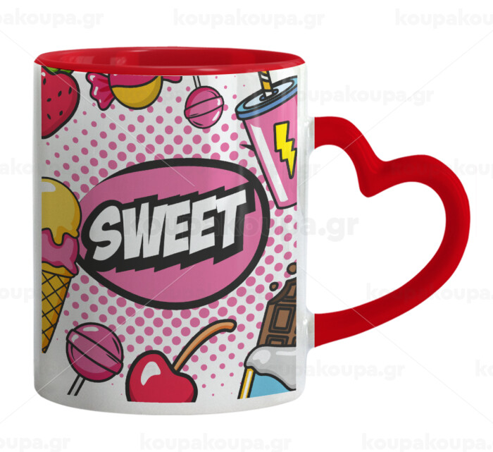 A glossy, high-quality mug with a heart-shaped handle and vibrant colors. Dishwasher safe and suitable for microwave use. Use it for hot and cold drinks.