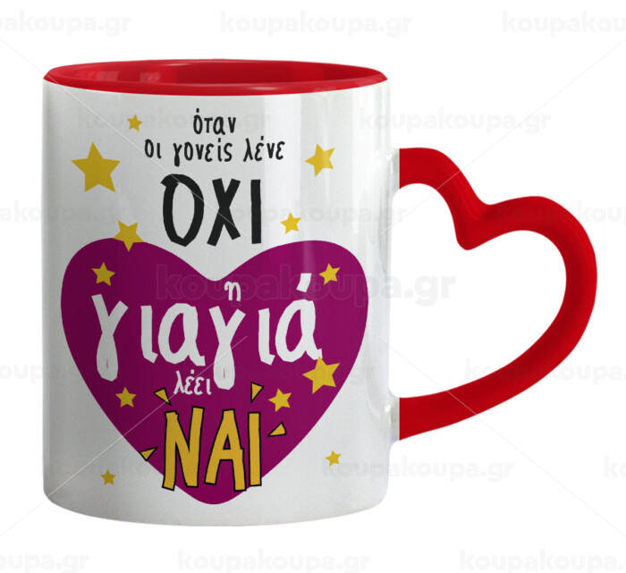 Όταν οι γονείς λένε ΟΧΙ, η γιαγιά λέει ΝΑΙ, Mug heart red handle, ceramic, 330ml