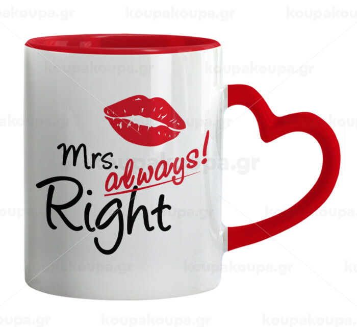 Mrs always right kiss, Mug heart red handle, ceramic, 330ml