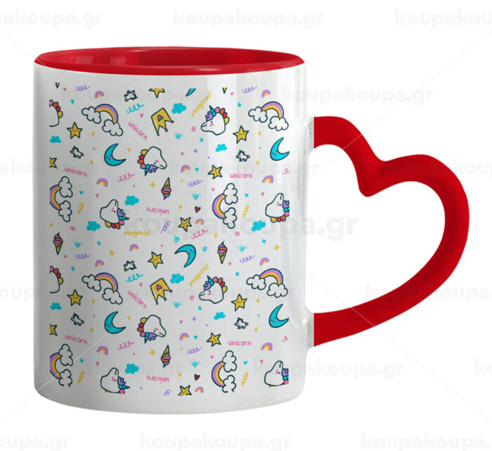 Unicorn pattern white, Mug heart red handle, ceramic, 330ml