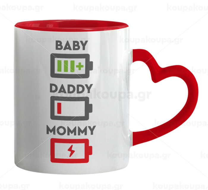 BABY, MOMMY, DADDY Low battery, Mug heart red handle, ceramic, 330ml
