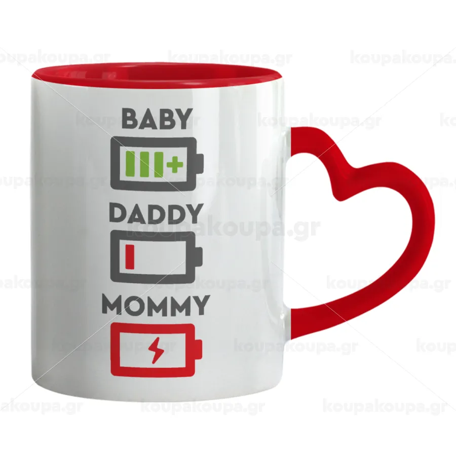 BABY, MOMMY, DADDY Low battery, Mug heart red handle, ceramic, 330ml