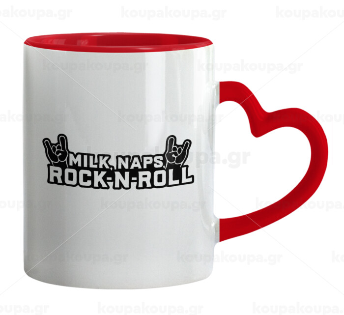 Milk, Naps, Rock N Roll, Mug heart red handle, ceramic, 330ml