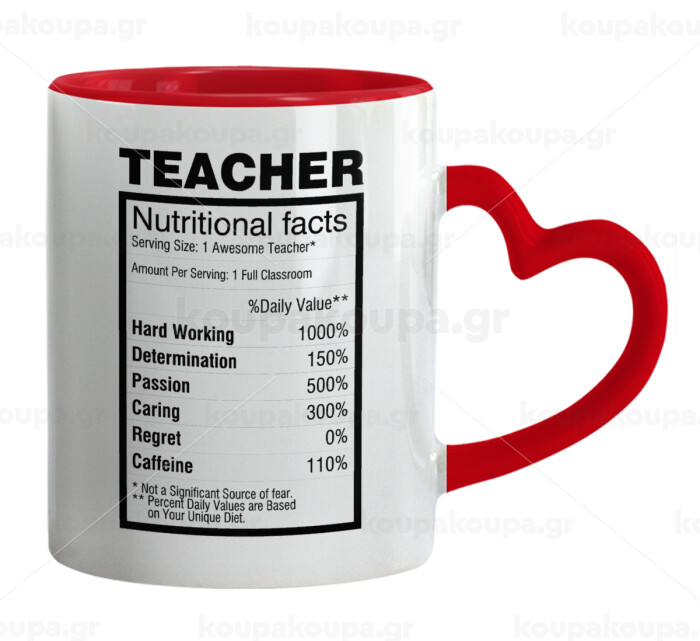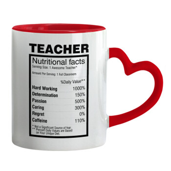 teacher nutritional facts, Mug heart red handle, ceramic, 330ml