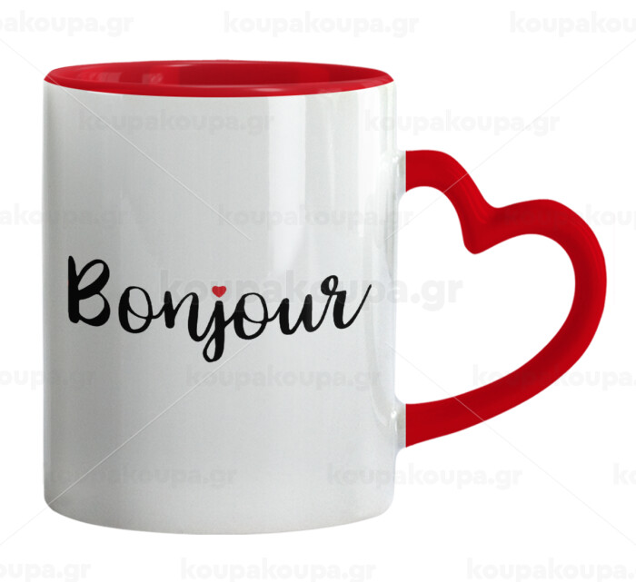 Bonjour, Mug heart red handle, ceramic, 330ml