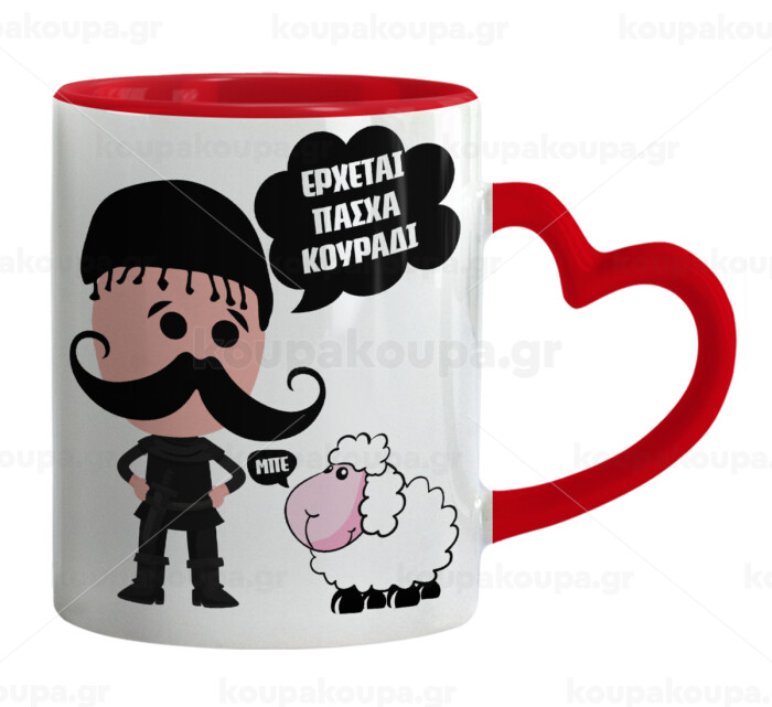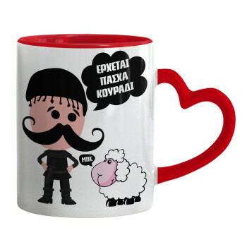 Κρητικός "Έρχεται Πάσχα κουράδι", Mug heart red handle, ceramic, 330ml