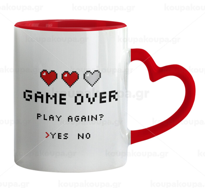 GAME OVER, Play again? YES - NO, Mug heart red handle, ceramic, 330ml