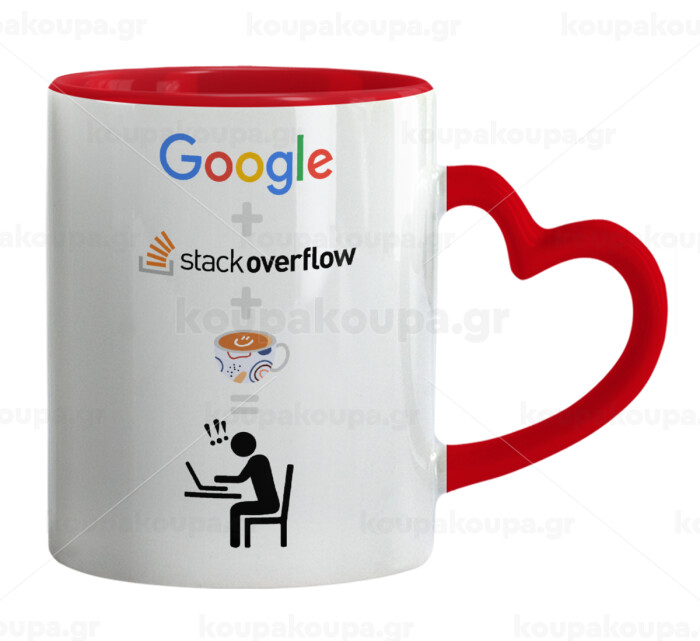 Google + Stack overflow + Coffee, Mug heart red handle, ceramic, 330ml