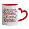 A glossy, high-quality mug with a heart-shaped handle and vibrant colors. Dishwasher safe and suitable for microwave use. Use it for hot and cold drinks.