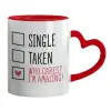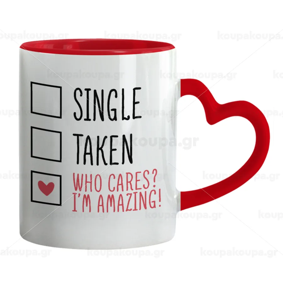 Single, Taken, Who cares i'm amazing, Mug heart red handle, ceramic, 330ml