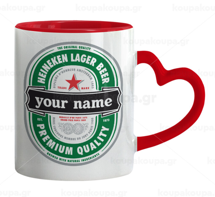 Heineken with name, Mug heart red handle, ceramic, 330ml
