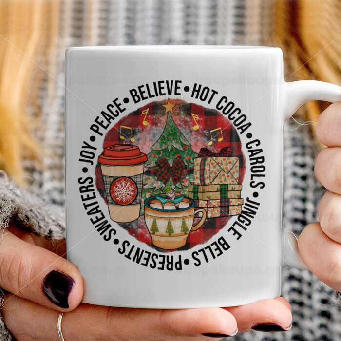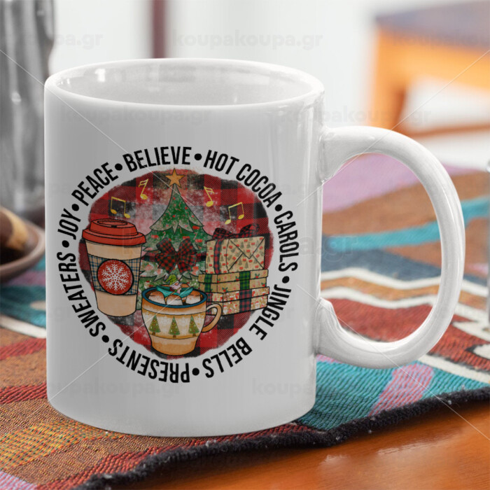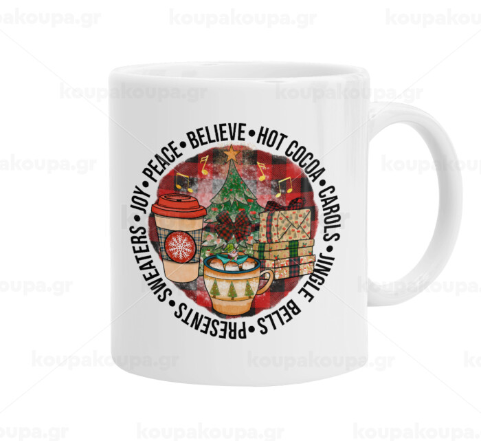 Joy, Peace, Believe, Hot Cocoa, Carols, Ceramic coffee mug, 330ml