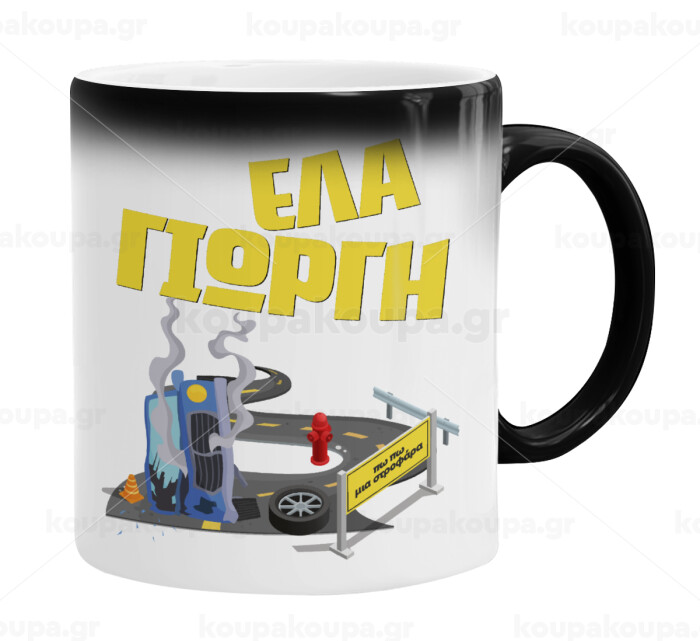 Έλα Γιώργη, πω πω μια στροφάρα, Color changing magic Mug, ceramic, 330ml when adding hot liquid inside, the black colour desappears (1 pcs)