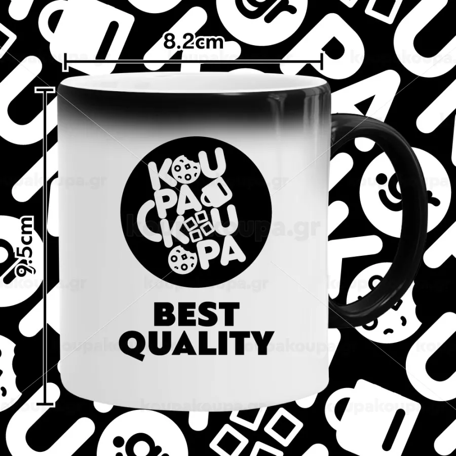 A shiny black magic cup of excellent quality with vibrant colors. With coffee, tea, water or any liquid from 50 degrees and above, the cup begins to reveal the surprise design. As soon as the liquid falls below 50 degrees and starts to cool, it turns black again.
