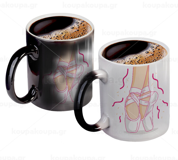 A shiny black magic cup of excellent quality with vibrant colors. With coffee, tea, water or any liquid from 50 degrees and above, the cup begins to reveal the surprise design. As soon as the liquid falls below 50 degrees and starts to cool, it turns black again.