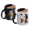 A shiny black magic cup of excellent quality with vibrant colors. With coffee, tea, water or any liquid from 50 degrees and above, the cup begins to reveal the surprise design. As soon as the liquid falls below 50 degrees and starts to cool, it turns black again.