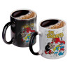 A shiny black magic cup of excellent quality with vibrant colors. With coffee, tea, water or any liquid from 50 degrees and above, the cup begins to reveal the surprise design. As soon as the liquid falls below 50 degrees and starts to cool, it turns black again.