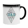 A shiny black magic cup of excellent quality with vibrant colors. With coffee, tea, water or any liquid from 50 degrees and above, the cup begins to reveal the surprise design. As soon as the liquid falls below 50 degrees and starts to cool, it turns black again.