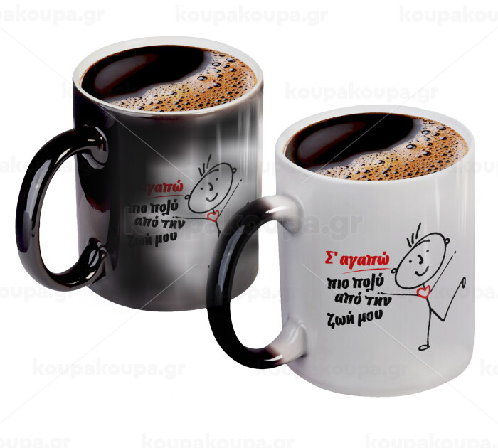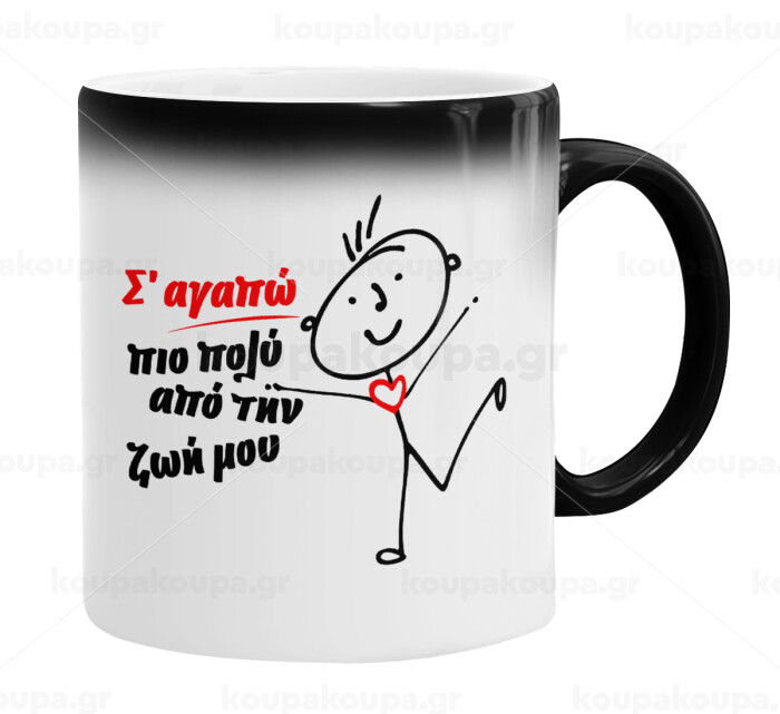 Σ'αγαπώ πιο πολύ από την ζωή μου!!!, Color changing magic Mug, ceramic, 330ml when adding hot liquid inside, the black colour desappears (1 pcs)
