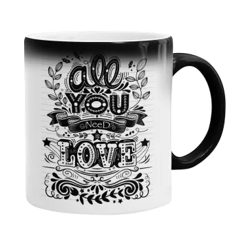 All you need is love, Color changing magic Mug, ceramic, 330ml when adding hot liquid inside, the black colour desappears (1 pcs)