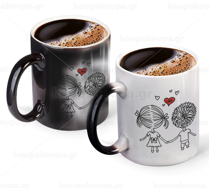 A shiny black magic cup of excellent quality with vibrant colors. With coffee, tea, water or any liquid from 50 degrees and above, the cup begins to reveal the surprise design. As soon as the liquid falls below 50 degrees and starts to cool, it turns black again.