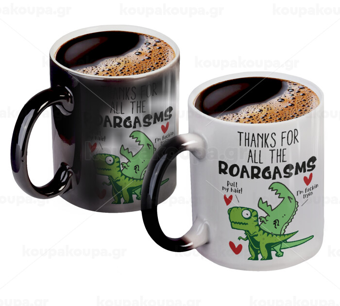 Thanks for all the ROARGASMS, Color changing magic Mug, ceramic, 330ml when adding hot liquid inside, the black colour desappears (1 pcs)