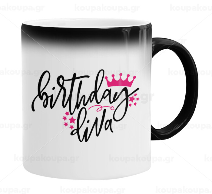 Birthday Diva queen, Color changing magic Mug, ceramic, 330ml when adding hot liquid inside, the black colour desappears (1 pcs)