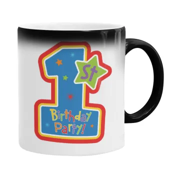 Happy 1st Birthday, Color changing magic Mug, ceramic, 330ml when adding hot liquid inside, the black colour desappears (1 pcs)